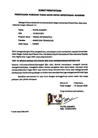 Putri Juniarti, - (2026) Text-To-Speech Bahasa Ocu Dialek Siak Hulu Menggunakan Metode VITS. Jurnal Teknik Informatika Unika ST. Thomas (JTIUST), 10 (2). pp. 292-300. ISSN pISSN : 2548-1916