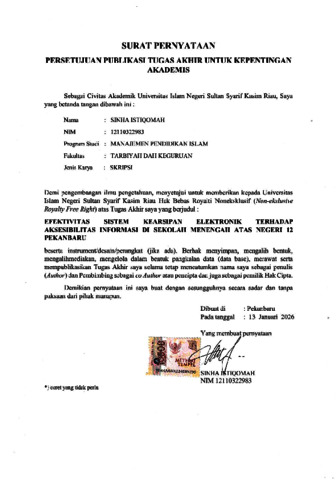 SINHA ISTIQOMAH, - (2026) EFEKTIVITAS SISTEM KEARSIPAN ELEKTRONIK TERHADAP AKSESIBILITAS INFORMASI DI SEKOLAH MENENGAH ATAS NEGERI 12 PEKANBARU. Skripsi thesis, Universitas Islam Negeri Sultan Syarif Kasim Riau.