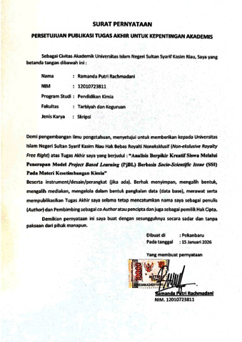 Ramanda Putri Rachmadani, - (2026) ANALISIS BERPIKIR KREATIF SISWA MELALUI PENERAPAN MODEL PROJECT BASED LEARNING (PjBL) BERBASIS SOCIO-SCIENTIFIC ISSUE (SSI) PADA MATERI KESETIMBANGAN KIMIA. Skripsi thesis, Universitas Islam Negeri Sultan Syarif Kasim Riau.