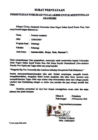 FATIMAH AZZAHROH, - (2026) PENGARUH BIG FIVE PERSONALITY DAN LONELINESS TERHADAP NOMOPHOBIA PADA MAHASISWA. Skripsi thesis, UNIVERSITAS ISLAM NEGERI SULTAN SYARIF KASIM RIAU.