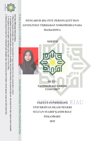 Pengaruh Big Five Personality dan Loneliness Terhadap Nomophobia Pada Mahasiswa Fatimah Azzahroh Fakultas Psikologi Universitas Islam Negeri Sultan Syarif Kasim Riau Ftimah.azzahrraa09@gmail.com ABSTRAK Smartphone memberi berbagai kemudahan dalam aktivitas sehari-hari. Beragam fitur menarik seperti game, media sosial, serta fasilitas foto dan video membuat pengguna semakin terdorong untuk terus menggunakannya. Situasi ini dapat memicu munculnya nomophobia, yaitu rasa cemas ketika seseorang berada jauh dari smartphone. Penelitian ini bertujuan untuk mengetahui pengaruh big five personality, dan loneliness terhadap nomophobia. Penelitian ini menggunakan desain korelasional dengan teknik purposive sampling. Sampel dalam penelitian ini yaitu mahasiswa aktif S1 dengan jumlah sampel yang digunakan sebanyak 347 orang. Data diperoleh menggunakan alat ukur Personality Item Pool Big-Five Factor Marker-25 (IPIP-BFM-25), Nomophobia Questionnaire (NMP-Q), dan UCLA Loneliness Scale yang telah diadaptasi dan dimodifikasi ke dalam bahasa Indonesia. Uji hipotesis dilakukan dengan uji regresi linear berganda. Hasil penelitian menunjukkan adanya pengaruh positif dan signifikan antara big five personality (opennes to experience, conscientiousness, extraversion, agreeableness, dan neuroticsm) dan loneliness terhadap nomophobia (R = 0,146; F = 9,667; p = 0,000). Hasil ini mengindikasikan bahwa kepribadian big five personality dan loneliness secara bersama-sama berpengaruh signifikan terhadap nomophobia pada mahasiswa. Kontribusi big five personality dan loneliness terhadap nomophobia sebesar 14,6%. Implikasi dari hasil penelitian ini adalah dapat memberikan manfaat sebagai dasar dalam perancangan psikoedukasi sebagai upaya preventif dalam mendorong penggunaan smartphone yang sehat dan terkontrol pada mahasiswa. Kata kunci: Big Five Personality, Loneliness, Nomophobia, Mahasiswa