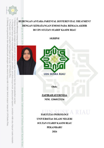 HUBUNGAN ANTARA PARENTAL DIFFERENTIAL TREATMENT DENGAN KEMATANGAN EMOSI PADA REMAJA AKHIR DI UIN SULTAN SYARIF KASIM RIAU Zafirah Ayurinisa Fakultas Psikologi Universitas Islam Negeri Sultan Syarif Kasim Riau zafirahayurinisa@gmail.com ABSTRAK Kematangan emosi adalah kemampuan mengarahkan dan mengendalikan emosi agar dapat diterima oleh diri sendiri dan orang lain. Remaja akhir seharusnya sudah mencapai kematangan emosi karena mulai memandang dirinya sebagai orang dewasa. Salah satu faktor yang memengaruhi kematangan emosi adalah parental differential treatment. Penelitian ini menguji hubungan antara parental differential treatment dengan kematangan emosi pada remaja akhir di UIN Sultan Syarif Kasim Riau. Responden berjumlah 230 orang yang ditentukan melalui teknik purposive sampling. Alat ukur yang digunakan adalah skala parental differential treatment dan skala kematangan emosi, dianalisis dengan korelasi Pearson product moment. Hasil penelitian ini menunjukkan terdapat hubungan negatif yang signifikan antara parental differential treatment dengan kematangan emosi (r= -0,235, p < 0,05) dan nilai signifikan sebesar 0,000. Hipotesis pada penelitian ini diterima, artinya semakin tinggi parental differential treatment maka akan semakin menurun kematangan emosi pada remaja akhir di UIN Sultan Syarif Kasim Riau, begitu pula sebaliknya. Hasil studi ini memperluas pemahaman teoritis mengenai parental differential treatment di Indonesia sekaligus menjadi dasar evaluasi bagi orang tua untuk mendukung kematangan emosi remaja. Kata kunci: Parental Differential Treatment, Kematangan Emosi, Remaja Akhir