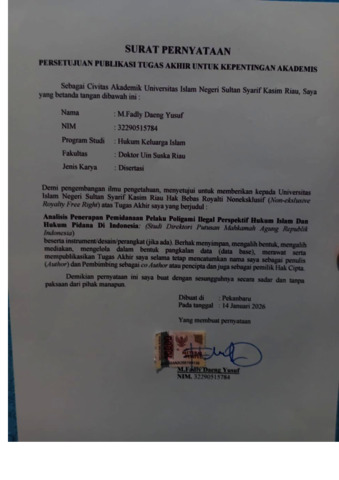 M. FADLY DAENG YUSUF, - (2026) ANALISIS PENERAPAN PEMIDANAAN PELAKU POLIGAMI ILEGAL PERSPEKTIF HUKUM ISLAM DAN HUKUM PIDANA DI INDONESIA ( Studi Direktori Putusan Mahkamah Agung Republik Indonesia). Disertasi thesis, UNIVERSITAS ISLAM NEGRI SULTAN SYARIF KASIM RIAU.
