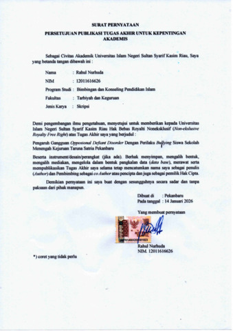 RAHUL NURHUDA (2026) PENGARUH GANGGUAN OPPOSIONAL DEFIANT DISORDER DENGAN PERILAKU BULLYING SISWA SMK TARUNA SATRIA PEKANBARU. Skripsi thesis, UNIVERSITAS ISLAM NEGERI SULTAN SYARIF KASIM RIAU.