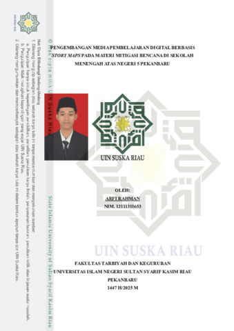 ABSTRAK Arfi Rahman, (2025) : Pengembangan Media Pembelajaran Digital Berbasis StoryMaps Pada Materi Mitigasi Bencana Di SMA Negeri 5 Pekanbaru Penelitian ini merupakan penelitian dan pengembangan (Research and Development) yang bertujuan untuk mengembangkan media pembelajaran digital berbasis StoryMaps pada mata pelajaran Geografi kelas XI dengan materi mitigasi bencana. Materi yang dikembangkan mencakup konsep bencana, jenis-jenis bencana, serta persebaran bencana di Indonesia. Pengembangan media dilakukan menggunakan model ADDIE yang meliputi tahap analysis, design, development, implementation, dan evaluation. Subjek penelitian terdiri atas ahli media, ahli materi, ahli praktisi, serta peserta didik kelas XI Engineering 2 SMA Negeri 5 Pekanbaru yang berjumlah 46 orang. Teknik pengumpulan data yang digunakan meliputi angket, wawancara, dan observasi. Data yang diperoleh dianalisis secara deskriptif kuantitatif untuk mengetahui tingkat kelayakan media yang dikembangkan. Hasil validasi menunjukkan bahwa media pembelajaran memperoleh persentase kelayakan sebesar 96,7% dari ahli materi, 98% dari ahli media, dan 96,8% dari ahli praktisi, yang seluruhnya termasuk dalam kategori “Sangat Layak”. Selain itu, hasil uji coba peserta didik menunjukkan persentase kelayakan sebesar 89,8% dengan kategori “Sangat Layak”. Berdasarkan hasil tersebut, dapat disimpulkan bahwa media pembelajaran digital berbasis StoryMaps yang dikembangkan dinyatakan sangat layak dan siap digunakan sebagai media pembelajaran Geografi kelas XI untuk mendukung pemahaman materi mitigasi bencana secara visual dan interaktif. Kata kunci: Media Pembelajaran Digital, StoryMaps, Mitigasi Bencana, Geografi, Penelitian dan Pengembangan.