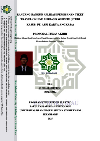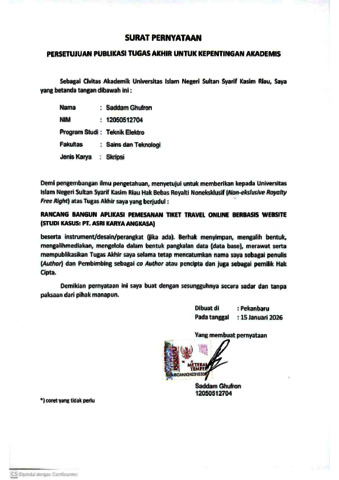 SADDAM GHUFRON (2026) RANCANG BANGUN APLIKASI PEMESANAN TIKET TRAVEL ONLINE BERBASIS WEBSITE (STUDI KASUS: PT. ASRI KARYA ANGKASA). Skripsi thesis, Universitas Islam Negeri Sultan Syarif Kasim.
