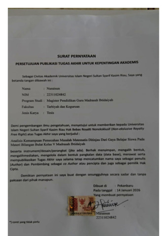 NURAINUN (2026) ANALISIS KEMAMPUAN PEMECAHAN MASALAH MATEMATIS DITINJAU DARI GAYA BELAJAR SISWA PADA MATERI BILANGAN BULAT KELAS V MADRASAH IBTIDAIYAH. Thesis thesis, UNIVERSITAS ISLAM NEGERI SULTAN SYARIF KASIM RIAU.