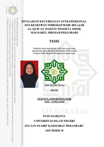 ABSTRAK Nur Wulandari Sunawir (2025) : Pengaruh Kecerdasan Intrapersonal dan Keaktifan terhadap Hasil Belajar Al-Qur’an Hadits Peserta Didik MAS Darul Hikmah Pekanbaru. Penelitian ini bertujuan untuk mengetahui seberapa besar pengaruh kecerdasan intrapersonal terhadap hasil belajar Al-Qur‘an Hadis, pengaruh keaktifan belajar terhadap hasil belajar Al-Qur‘an Hadis, dan seberapa besar pengaruh kecerdasan intrapersonal dan dan keaktifan belajar peserta didik secara simultan terhadap hasil belajar Al-Qur‘an Hadis. Penelitian ini adalah penelitian survei dengan pendekatan kuantitatif. Penelitian dilakukan di Madrasah Aliyah Swasta Darul Hikmah Pekanbaru. Sampel penelitian ini adalah 115 Responden dari total populasi 165 peserta didik. Analisis data menggunakan uji regresi linier sederhana dan regresi linier berganda dengan hasil uji statistik yang menunjukkan bahwa nilai r hitung setiap item kecerdasan intrapersonal lebih besar dari r tabel (0,361). Selain itu, instrumen kecerdasan intrapersonal memiliki nilai Cronbach Alpha sebesar 0,82, yang berada di atas batas minimal 0,60. Data ini menunjukkan bahwa kecerdasan intrapersonal peserta didik, yang mencakup kesadaran diri, kemampuan mengelola emosi, dan motivasi belajar, berkontribusi nyata terhadap peningkatan hasil belajar Al-Qur‘an Hadis. Keaktifan belajar berpengaruh positif terhadap hasil belajar Al-Qur‘an Hadis. Hasil uji validitas menunjukkan seluruh item keaktifan belajar memiliki nilai r hitung > r tabel, serta hasil uji reliabilitas menunjukkan nilai Cronbach Alpha sebesar 0,85, yang menandakan instrumen sangat reliabel.. Berdasarkan hasil uji simultan, nilai F hitung lebih besar daripada F tabel dengan tingkat signifikansi lebih kecil dari 0,05, sehingga hipotesis nol (H₀) ditolak. Temuan penelitian ini adalah bahwa upaya peningkatan hasil belajar Al-Qur‘an Hadits perlu dilakukan secara komprehensif, dengan memperhatikan faktor internal dan eksternal peserta didik. Guru tidak hanya dituntut untuk menyampaikan materi dengan baik, tetapi juga perlu mengembangkan strategi pembelajaran yang dapat menumbuhkan kesadaran diri, motivasi intrinsik, dan keaktifan belajar peserta didik. Kata kunci: Kecerdasan Intrapersonal, Keaktifan Belajar, Hasil Belajar