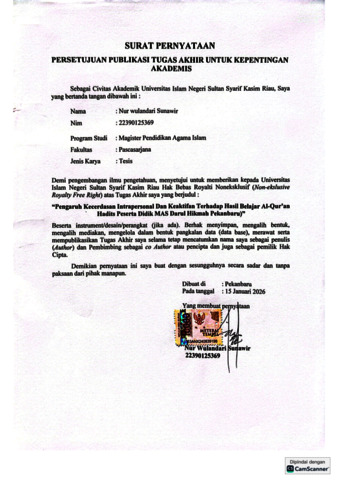 NURWULANDARI SUNAWIR, - (2026) PENGARUH KECERDASAN INTRAPERSONAL DANKEAKTIFANTERHADAP HASIL BELAJAR AL-QUR’AN HADITS PESERTA DIDIK MAS DARUL HIKMAH PEKANBARU. Thesis thesis, UNIVERSITAS ISLAM NEGRI SULTAN SYARIF KASIM RIAU.