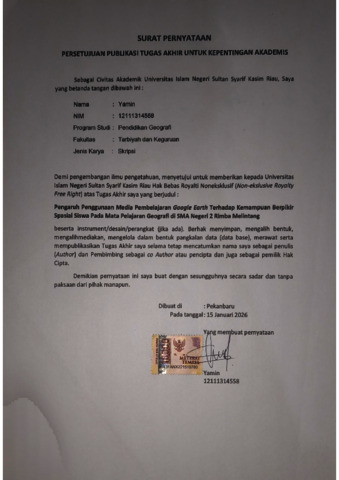 YAMIN (2026) PENGARUH PENGGUNAAN MEDIA PEMBELAJARAN GOOGLE EARTH TERHADAP KEMAMPUAN BERPIKIR SPASIAL SISWA PADA MATA PELAJARAN GEOGRAFI DI SMA NEGERI 2 RIMBA MELINTANG. Skripsi thesis, UNIVERSITAS ISLAM NEGERI SULTAN SYARIF KASIM RIAU.