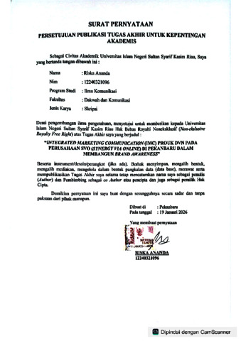 RISKA ANANDA, - (2026) INTEGRATED MARKETING COMMUNICATION (IMC) PRODUK DVN PADA PERUSAHAAN SVO (SYNERGY VIA ONLINE) DI PEKANBARU DALAM MEMBANGUN BRAND AWARENESS. Skripsi thesis, UNIVERSITAS ISLAM NEGERI SULTAN SYARIF KASIM RIAU.
