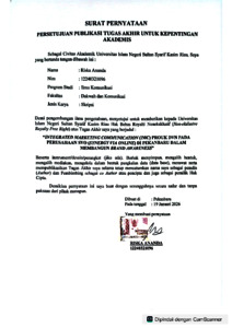 ABSTRAK Nama : Riska Ananda Jurusan : Ilmu Komunikasi Judul : “Integrated Marketing Communication (IMC) Produk Dvn Pada Perusahaan Svo (Synergy Via Online) Di Pekanbaru Dalam Membangun Brand Awareness” Penggunaan komunikasi pemasaran berbasis digital menjadi aspek yang menarik perhatian peneliti, terutama meningkatnya pengguna media digital dan peminat mengonsumsi produk kecantikan yang membuka peluang pasar di Pekanbaru. Namun, penjualan produk DVN pada perusahaan SVO (Synergy Via Online) masih kurang optimal sehingga belum sepenuhnya memanfaatkan peluang. Selain itu, efektivitas dari komunikasi pemasaran yang dilakukan secara online sering terhalang oleh masalah kepercayaan dan kredibilitas di kalangan konsumen. Berdasarkan fenomena ini, peneliti tertarik untuk menyelidiki bagaimana SVO menerapkan Integrated Marketing Communication (IMC) produk DVN di Pekanbaru dalam Membangun Brand Awareness. Penelitian ini menggunakan metode deskriptif kualitatif berdasarkan Fiantika, karena memberikan deskripsi secara menyeluruh mengenai fenomena yang diteliti. Hasil penelitian menunjukkan bahwa pembangunan brand awareness di kalangan target konsumen (Bunda) dilakukan melalui pendekatan digital yang terintegrasi antara kekuatan data teknis dan sentuhan emosional personal. Adanya, tantangan berupa pemblokiran kontak atau rendahnya pemahaman konsumen terhadap merek dapat diatasi ketika perusahaan mampu menyelaraskan estetika visual yang premium dengan komunikasi yang mengedepankan empati. Kata Kunci: Integrated Marketing Communication (IMC), Pemasaran Online, Produk DVN
