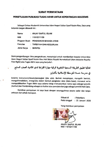 ANJAY SAIFUL ISLAM (2026) Efektivitas Metode Sam’iyah Safawiyyah Untuk Meningkatkan Maharoh Qiroah Pada Siswa Kelas VII MTs Hasanah Pekanbaru. Skripsi thesis, UNIVERSITAS ISLAM NEGERI SULTAN SYARIF KASIM RIAU.