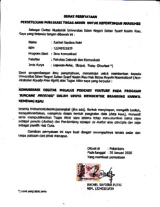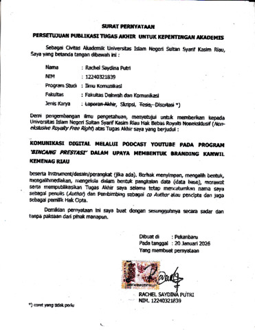 RACHEL SAYDINA PUTRI, - (2026) KOMUNIKASI DIGITAL MELALUI PODCAST YOUTUBE PADA PROGRAM ‘BINCANG PRESTASI’ DALAM UPAYA MEMBENTUK BRANDING KANWIL KEMENAG RIAU. Skripsi thesis, UNIVERSITAS ISLAM NEGERI SULTAN SYARIF KASIM RIAU.