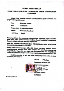 i ABSTRAK ANALISIS KINERJA PEGAWAI DALAM PENGELOLAAN ARSIP DI KANTOR CAMAT TUALANG KABUPATEN SIAK OLEH DIRA FEBRIA YUDISTIRA NIM : 12170522093 Penelitian ini bertujuan untuk menganalisis kinerja pegawai dalam pengelolaan kearsipan sebagai bagian dari upaya peningkatan efektivitas pelayanan administrasi di lingkungan kantor camat. Pengelolaan arsip yang baik dinilai menjadi faktor penting dalam mempercepat proses pelayanan surat, menyediakan dokumen secara akurat, serta memastikan alur kerja organisasi berjalan sesuai standar. Metode penelitian menggunakan pendekatan deskriptif kualitatif dengan teknik pengumpulan data melalui wawancara, observasi, dan dokumentasi. Hasil penelitian menunjukkan bahwa kinerja pegawai dalam pengelolaan arsip masih belum optimal, terutama terkait ketepatan waktu pencarian dokumen, kualitas kerja dalam penataan dan pencatatan arsip, serta konsistensi dalam mematuhi prosedur kerja. Kendala lainnya meliputi sistem pengarsipan yang belum terstruktur, kurangnya pengawasan rutin, serta belum efektifnya manajemen beban kerja, sehingga berdampak pada lambatnya proses pelayanan kepada masyarakat. Temuan tersebut mengindikasikan perlunya perbaikan melalui penguatan disiplin kerja, peningkatan kompetensi pegawai, serta pengembangan sistem pengarsipan yang lebih modern dan terintegrasi. Dengan perbaikan tersebut, diharapkan pengelolaan kearsipan dapat berjalan lebih efisien dan mendukung peningkatan kualitas pelayanan publik secara keseluruhan. Kata Kunci: Kinerja, Pengelolaan, Kearsipan.