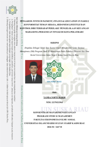 i ABSTRAK PENGARUH FINTECH PAYMENT, FINANCIAL EDUCATION IN FAMILY, KONFORMITAS TEMAN SEBAYA, HEDONISM LIFESTYLE DAN KONTROL DIRI TERHADAP PERILAKU PENGELOLAAN KEUANGAN MAHASISWA PERGURUAN TINGGI DI KOTA PEKANBARU OLEH: YANDA NOFTI HARDI NIM. 12170111965 Penelitian ini dilakukan pada mahasiswa yang menempuh pendidikan perguruan tinggi di Kota Pekanbaru. Tujuan dari penelitian ini untuk mengetahui pengaruh fintech payment, financial education in family, konformitas teman sebaya, hedonism lifestyle dan kontrol diri terhadap perilaku pengelolaan keuangan mahasiswa. Penelitian menggunakan pendekatan kuantitatif dan analisis regresi berganda dengan populasi yaitu mahasiswa perguruan tinggi di Kota Pekanbaru yang berjumlah 25.818 mahasiswa. Metode pengambilan sampel menggunakan non probability samping dengan pendekatan accidental sampling. Sampel penelitian ini berjumlah 324 mahasiswa. Hasil penelitian ini menunjukkan secara parsial financial education in family, konformitas teman sebaya dan kontrol diri berpengaruh positif dan signifikan terhadap perilaku pengelolaan keuangan mahasiswa, sedangkan fintech payment berpengaruh negatif signifikan terhadap perilaku pengelolaan keuangan mahasiswa. Koefisien Determinasi (R²) dengan nilai 0,279 atau 27,9% variabel dependent penelitian ini dipengaruhi oleh financial technology, financial literacy, financial attitude dan locus of control secara simultan sebesar 27,9%, sementara sisanya 72,1% dipengaruhi oleh variabel lain yang tidak digunakan dalam penelitian ini. Kata kunci: fintech payment, financial education in family, konformitas teman sebaya, hedonism lifestyle, kontrol diri,perilaku pengelolaan keuangan