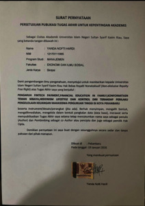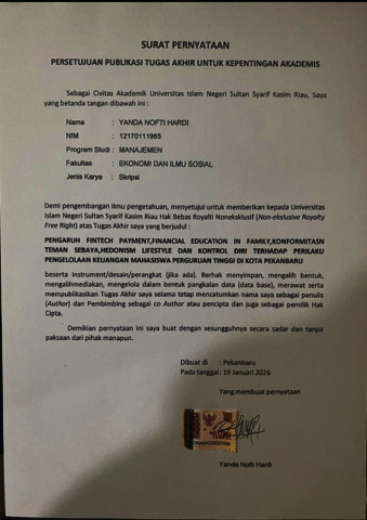 YANDA NOFTI HARDI (2026) PENGARUH FINTECH PAYMENT, FINANCIAL EDUCATION IN FAMILY, KONFORMITAS TEMAN SEBAYA, HEDONISM LIFESTYLE DAN KONTROL DIRI TERHADAP PERILAKU PENGELOLAAN KEUANGAN MAHASISWA PERGURUAN TINGGI DI KOTA PEKANBARU. Skripsi thesis, Universitas Islam Negeri Sultan Syarif Kasim.