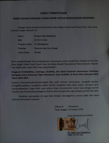 M. IQBAL QARD MATARENG (2026) PENGARUH PROFITABILITAS, LEVERAGE, LIKUIDITAS, DAN GOOD CORPORATE GOVERNANCE TERHADAP PERINGKAT SUKUK KORPORASI PADA PERUSAHAAN YANG TERDAFTAR DI BURSA EFEK INDONESIA (BEI) TAHUN 2022-2024. Skripsi thesis, Universitas Islam Negeri Sultan Syarif Kasim.