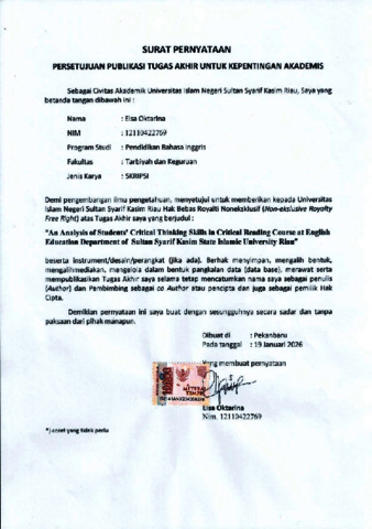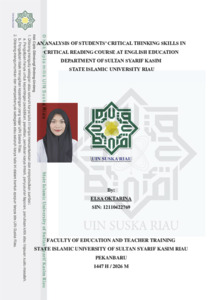 ELSA OKTARINA, - (2026) AN ANALYSIS OF STUDENTS’ CRITICAL THINKING SKILLS IN CRITICAL READING COURSE AT ENGLISH EDUCATION DEPARTMENT OF SULTAN SYARIF KASIM STATE ISLAMIC UNIVERSITY RIAU. Skripsi thesis, UNIVERSITAS ISLAM NEGERI SULTAN SYARIF KASIM RIAU.