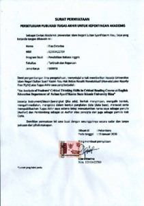 AN ANALYSIS OF STUDENTS’ CRITICAL THINKING SKILLS IN CRITICAL READING COURSE AT ENGLISH EDUCATION DEPARTMENT OF SULTAN SYARIF KASIM STATE ISLAMIC UNIVERSITY RIAU
