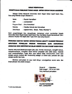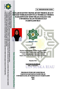 FAUZIAH RAMADHANI, - (2026) PENGARUH KONTEN TIKTOK REVIEW PRODUK BEAUTY VLOGGER TERHADAP KEPUTUSAN PEMBELIAN PRODUK MAHASISWI ILMU KOMUNIKASI ANGKATAN 2022 UNIVERSITAS ISLAM NEGERI SULTAN SYARIF KASIM RIAU. Skripsi thesis, UNIVERSITAS ISLAM NEGERI SULTAN SYARIF KASIM RIAU.