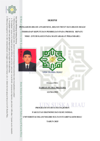 i ABSTRAK PENGARUH BRAND AWARENESS, BRAND TRUST DAN BRAND IMAGE TERHADAP KEPUTUSAN PEMBELIAN PADA PRODUK SEPATU NIKE (STUDI PADA MASYARAKAT PEKANBARU) Oleh: FARHAN PUTRA PRATAMA NIM: 12170113952 Keputusan pembelian adalah fase di saat konsumen menyadari kebutuhan, mengumpulkan informasi tentang berbagai merek atau produk, membandingkan pilihan dalam menghadapi masalah tersebut, dan kemudian memilih untuk melakukan pembelian. Adapun tujuan dilakukannya penelitian ini untuk mengetahui pengaruh Brand Awareness, Brand Trust dan Brand Image terhadap keputusan pembelian pada produk sepatu Nike. Populasi dalam penelitian ini berjumlah 96 responden dengan menggunakan metode purposive sampling. Berdasarkan hasil penelitian ini menunjukkan bahwa secara parsial Brand Awareness berpengaruh positif dan signifikan terhadap keputusan pembelian, Brand Trust berpengaruh positif dan signifikan terhadap keputusan pembelian dan Brand Image berpengaruh positif dan signifikan terhadap keputusan pembelian. Secara simultan Brand Awareness, Brand Trust dan Brand Image berpengaruh positif dan signifikan terhadap keputusan pembelian. Koefisien Determinasi (R2) menunjukkan bahwa besarnya pengaruh dari ketiga variabel bebas secara bersama- sama terhadap variabel terikatnya sebesar 81,3% dan sisanya sebesar 18,7% merupakan variabel lain yang tidak diteliti kedalam penelitian ini. Kata Kunci : Keputusan