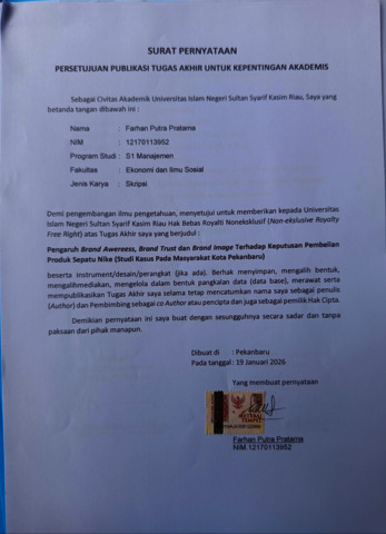 FARHAN PUTRA PRATAMA (2026) PENGARUH BRAND AWERENESS, BRAND TRUST DAN BRAND IMAGE TERHADAP KEPUTUSAN PEMBELIAN PRODUK SEPATU NIKE (STUDI KASUS PADA MASYARAKAT KOTA PEKANBARU). Skripsi thesis, Universitas Islam Negeri Sultan Syarif Kasim.