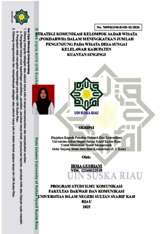 IRMA GUSRIANI, - (2026) STRATEGI KOMUNIKASI KELOMPOK SADAR WISATA (POKDARWIS) DALAM MENINGKATKAN JUMLAH PENGUNJUNG PADA WISATA DESA SUNGAI KELELAWAR KABUPATEN KUANTAN SINGINGI. Skripsi thesis, UNIVERSITAS ISLAM NEGERI SULTAN SYARIF KASIM RIAU.