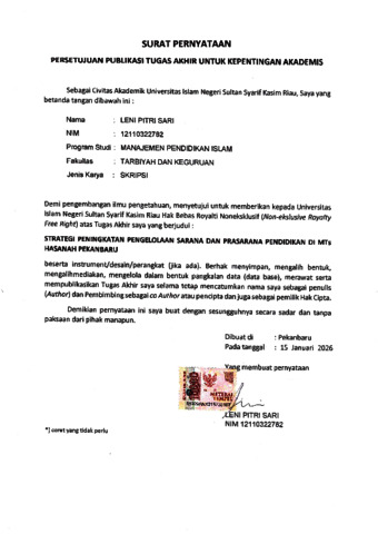 LENI PITRI SARI, - (2026) STRATEGI PENINGKATAN PENGELOLAAN SARANA DAN PRASARANA PENDIDIKAN DI MTs HASANAH PEKANBARU. Skripsi thesis, UNIVERSITAS ISLAM NEGERI SULTAN SYARIF KASIM RIAU.