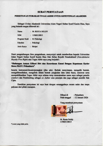 M RESTA NELDY, - (2026) HUBUNGAN ANTARA EFIKASI DIRI DAN KECERDASAN EMOSI DENGAN KEPUTUSAN KARIER SISWA MAN 1 PEKANBARU. Skripsi thesis, UNIVERSITAS ISLAM NEGERI SULTAN SYARIF KASIM RIAU.
