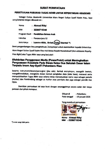 ABSTRAK Efektivitas Penggunaan Media (PowerPoint) untuk Meningkatkan Penguasaan Kosakata pada Siswa Kelas Dua Sekolah Dasar Islam Terpadu Al-Imam Asy-Syafi'i Pekanbaru Riau Ahmad Rifqi (2025): Penelitian ini bertujuan untuk mengetahui Efektivitas Penggunaan Media (PowerPoint) untuk Meningkatkan Penguasaan Kosakata pada Siswa Kelas Dua Sekolah Dasar Islam Terpadu Al-Imam Asy-Syafi'i Pekanbaru Riau, dengan menjawab dua pertanyaan utama: Apakah ada perbedaan tertentu dalam pemahaman kosakata siswa sebelum dan sesudah belajar menggunakan PowerPoint, dan apakah penggunaan media (PowerPoint) efektif untuk meningkatkan penguasaan kosakata pada siswa kelas dua Sekolah Dasar Islam Terpadu Al-Imam Asy-Syafi'i Pekanbaru Riau. Penelitian ini menggunakan pre-eksperimental dalam bentuk desain kelompok tunggal dengan (One-Group Pretest-Posttest Design), dengan kelas II A sebagai kelompok eksperimen, yang terdiri dari 28 siswa. Instrumen yang digunakan meliputi observasi dan tes pretest serta posttest, dan data analisis menggunakan uji paired sample T Test melalui program SPSS. Hasil penelitian menunjukkan bahwa Rata-rata nilai kelompok eksperimen meningkat dari 53.75 pada pretest menjadi 81.42 pada posttest, dengan nilai t hitung (12.642) lebih besar dari pada t tabel baik itu 5% (1.703) begitu juga pada 1% (2,473). Dan nilai signifikansi Sig= 0.001 < 0,05 lebih kecil dari t pada tabel yang menunjukkan adanya perbedaan yang signifikan secara statistik dengan kenaikan skor 28 poin lebih tinggi. Berdasarkan temuan ini, penggunaan media (powerpoint) efektif untuk meningkatkan penguasaan kosakata. Kata Kunci: Media Power Point, Penguasaan Kosa Kata