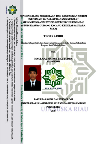 MAULANA MA’RUF EKA YUDHA, - (2026) PENGENDALIAN PERSEDIAAN DAN RANCANGAN SISTEM INFORMASI DATABASE KACANG KEDELAI MENGGUNAKAN METODE HEURISTIC SILVER MEAL (STUDI KASUS: GUDANG KACANG KEDELAI SAUDARA JAYA). Skripsi thesis, UNIVERSITAS ISLAM NEGERI SULTAN SYARIF KASIM RIAU.