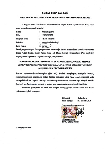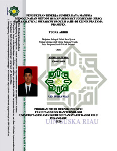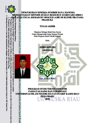 PENGUKURAN KINERJA SUMBER DAYA MANUSIA MENGGUNAKAN METODE HUMAN RESOURCE SCORECARD (HRSC) DAN ANALYTICAL HIERARCHY PROCESS (AHP) DI KLINIK PRATAMA PRAMUKA ANDRA SAPUTRA NIM : 12050210328 Jurusan Teknik Industri Fakultas Sains dan Teknologi Universitas Islam Negeri Sultan Syarif Kasim Riau Jl. HR. Soebrantas Km. 15 No. 155, Pekanbaru ABSTRAK Penelitian ini bertujuan untuk mengukur kinerja sumber daya manusia (SDM) di Klinik Pratama Pramuka menggunakan metode Human Resource Scorecard (HRSC) yang dikombinasikan dengan Analytical Hierarchy Process (AHP). Metode HRSC digunakan untuk mengidentifikasi dan mengukur kinerja berdasarkan empat perspektif utama, yaitu keuangan, pelanggan, proses internal, serta pembelajaran dan pertumbuhan. Sementara itu, metode AHP diterapkan untuk menentukan bobot prioritas dari setiap kriteria dan subkriteria berdasarkan penilaian pakar. Data utama dalam penelitian ini diperoleh dari laporan Key Performance Indicator (KPI) Klinik Pratama Pramuka tahun 2024, sedangkan data pendukung berasal dari hasil kuesioner perbandingan berpasangan yang diisi oleh tiga responden ahli di lingkungan klinik. Sebelum dianalisis, kuesioner diuji validitas dan reliabilitasnya menggunakan metode Aiken’s V dan Cronbach’s Alpha untuk memastikan keakuratan dan konsistensi instrumen penelitian. Hasil penelitian menunjukkan bahwa perspektif proses internal memiliki bobot tertinggi dibandingkan kriteria lainnya, yang berarti efektivitas operasional dan koordinasi antarbagian merupakan faktor dominan dalam peningkatan kinerja SDM. Penelitian ini diharapkan dapat memberikan kontribusi praktis bagi pihak manajemen klinik dalam pengambilan keputusan strategis, serta menjadi referensi akademik bagi penelitian selanjutnya terkait pengukuran kinerja SDM di sektor pelayanan kesehatan. Kata Kunci : Human Resource Scorecard (HRSC), Analytical Hierarchy Process (AHP), Kinerja Sumber Daya Manusia, Klinik Pratama Pramuka, KPI.