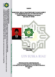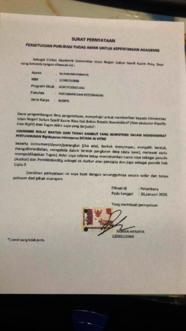 SKRINNING ISOLAT BAKTERI DARI TANAH GAMBUT YANG BERPOTENSI DALAM MENGHAMBAT PERTUMBUHAN Rigidoporus microporus SECARA IN VITRO M.Raihan Hanafia (12080210868) Di bawah bimbingan Syukria Ikhsan Zam dan Elfi Rahmadani INTISARI Gambut berpotensi sebagai sumber bakteri tanah penghasil agen antagonis yang dapat digunakan sebagai pengendali hayati Rigidoporus microporus. Penelitian ini bertujuan untuk mendapatkan bakteri asal tanah gambut yang berpotensi sebagai agen antagonis terhadap Rigidoporus microporus. Penelitian ini telah dilaksanakan pada bulan Juli-November 2025 di Laboratorium Patologi, Entomologi, Mikrobiologi dan Ilmu Tanah Fakultas Pertanian dan Peternakan Universitas Islam Negeri Sultan Syarif Kasim Riau. Penelitian ini menggunakan metode deskriptif kualitatif. Isolasi dilakukan pada tanah gambut dengan metode pengenceran berseri. Hasil penelitian menunjukan populasi bakteri tanah gambut berjumlah 6,95 x 108 CFU/mL dan didapat 5 isolat bakteri (IS 1, IS 2, IS3, IS 4, dan IS 5) yang berasal dari kelompok bakteri Gram negatif dan memiliki akivitas katalase. Dari 5 isolat hanya ada 3 yang memperlihatkan daya hambat terhadap R. microporus dengan persentase tinggi 75,6%. Kata Kunci : gambut, bakteri, R. microporus, aktivitas daya hambat