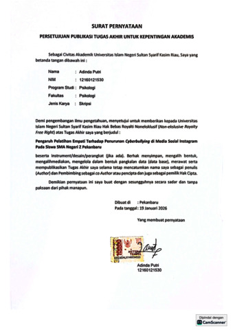 ADINDA PUTRI, - (2026) PENGARUH PELATIHAN EMPATI TERHADAP PENURUNAN CYBERBULLYING DI MEDIA SOSIAL INSTAGRAM PADA SISWA SMA NEGERI Z PEKANBARU. Skripsi thesis, Universitas Islam Negeri Sultan Syarif Kasim Riau.