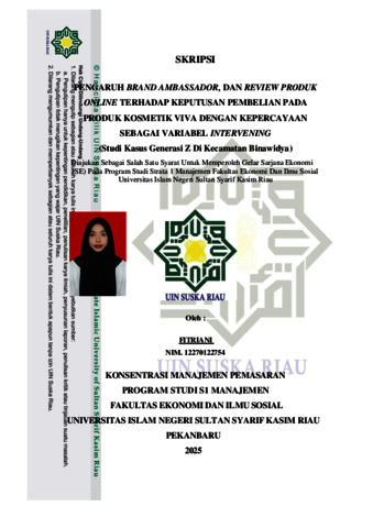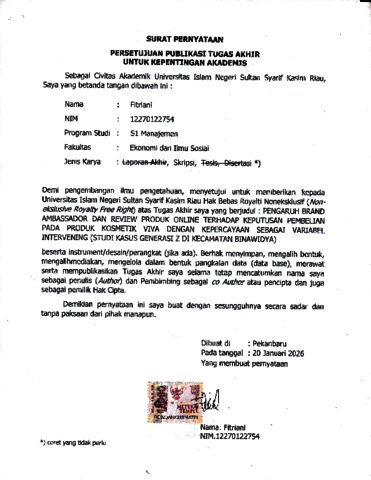 FITRIANI, - (2026) PENGARUH BRAND AMBASSADOR, DAN REVIEW PRODUK ONLINE TERHADAP KEPUTUSAN PEMBELIAN PADA PRODUK KOSMETIK VIVA DENGAN KEPERCAYAAN SEBAGAI VARIABEL INTERVENING (Studi Kasus Generasi Z Di Kecamatan Binawidya). Skripsi thesis, UNIVERSITAS ISLAM NEGERI SULTAN SYARIF KASIM RIAU.