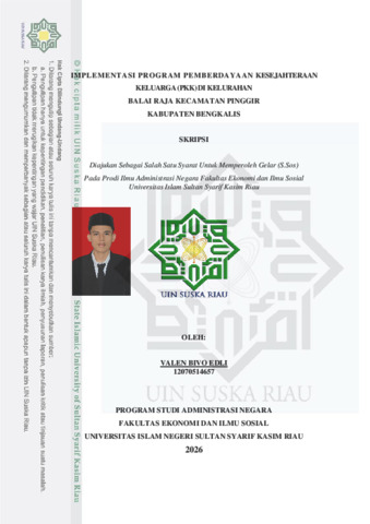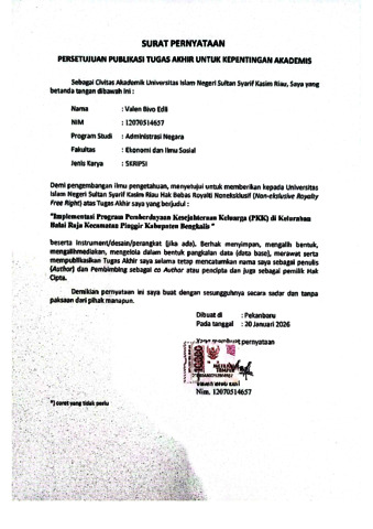 ABSTRAK IMPLEMENTASI PROGRAM PEMBERDAYAAN KESEJAHTERAAN KELUARGA (PKK) DI KELURAHAN BALAI RAJA KECAMATAN PINGGIR KABUPATEN BENGKALIS Oleh VALEN BIVO EDLI 12070514657 Penelitian ini bertujuan untuk mendeskripsikan dan menganalisis implementasi Program Pemberdayaan Kesejahteraan Keluarga (PKK) di Kelurahan Balai Raja, Kecamatan Pinggir, Kabupaten Bengkalis. Program PKK merupakan salah satu program pemerintah yang berfokus pada peningkatan kesejahteraan keluarga melalui pemberdayaan masyarakat, khususnya kaum perempuan, dengan melibatkan partisipasi aktif masyarakat dalam berbagai bidang kehidupan sosial, ekonomi, dan kesehatan. Penelitian ini menggunakan pendekatan kualitatif dengan metode deskriptif. Teknik pengumpulan data dilakukan melalui wawancara mendalam, observasi, dan dokumentasi. Informan penelitian ditentukan secara purposive, terdiri dari pengurus PKK, aparat kelurahan, serta masyarakat yang terlibat dalam pelaksanaan program PKK. Hasil penelitian menunjukkan bahwa implementasi Program PKK di Kelurahan Balai Raja telah dilaksanakan, namun belum berjalan secara optimal. Beberapa program masih menghadapi kendala, seperti keterbatasan sumber daya manusia, rendahnya partisipasi masyarakat, serta minimnya pemahaman masyarakat terhadap tujuan dan manfaat program. Kondisi tersebut berdampak pada belum maksimalnya pencapaian tujuan pemberdayaan dan peningkatan kesejahteraan keluarga. Oleh karena itu, diperlukan upaya peningkatan koordinasi, pembinaan, serta penguatan peran masyarakat agar pelaksanaan Program PKK dapat berjalan lebih efektif dan berkelanjutan. . Kata Kunci: Implementasi, Program PKK, Pemberdayaan, Kesejahteraan Keluarga, Balai Raja