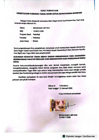 MUHAMMAD LUTFI AMRI, - (2026) HUBUNGAN KELEKATAN TEMAN SEBAYA DENGAN KEBIJAKSANAAN PADA MAHASISWA BERORGANISASI FAKULTAS PSIKOLOGI YANG DIMODERATORI OLEH PENGGUNAAN MEDIA SOSIAL. Skripsi thesis, Universitas Islam Negeri Sultan Syarif Kasim Riau.