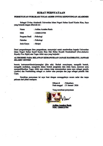 ARDINA AZZAHRA RAZIZ, - (2026) ALTRUISME PADA RELAWAN KEMANUSIAAN JANAIZ RAUDHATUL JANNAH ISLAMIC CENTER. Skripsi thesis, Universitas Islam Negeri Sultan Syarif Kasim Riau.