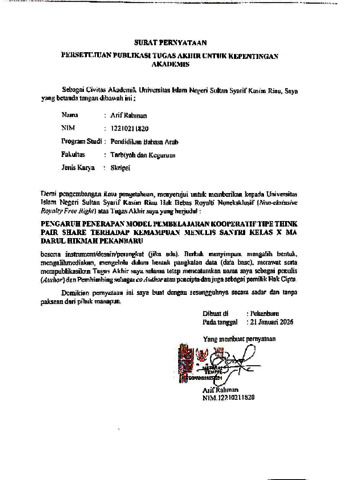 -, ARIF RAHMAN (2026) PENGARUH PENERAPAN MODEL PEMBELAJARAN KOOPERATIF TIPE THINK PAIR SHARE TERHADAP KEMAMPUAN MENULIS SANTRI KELAS X MA DARUL HIKMAH PEKANBARU. Skripsi thesis, Uin Sultan Syarif Kasim Riau.