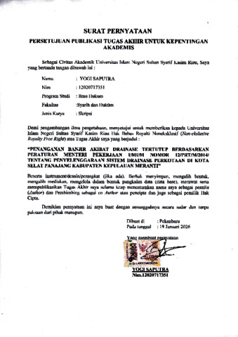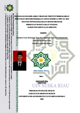 YOGI SAPUTRA (2026) PENANGANAN BANJIR AKIBAT DRAINASE TERTUTUP BERDASARKAN PERATURAN MENTERI PEKERJAAN UMUM NOMOR 12 / PRT/ M / 2014 TENTANG PENYELENGGARAAN SISTEM DRAINASE PERKOTAAN DI KOTA SELAT PANJANG KABUPATEN KEPULAUAN MERANTI. Skripsi thesis, Universitas Islam Negeri Sultan Syarif Kasim.
