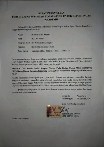 ABSTRAK Analisis Tata Kelola Usaha Simpan Pinjam Pada Badan Usaha Milik Kampung (BUMKam) Karya Bersama Kampung Dayang Suri Kecamatan Bungaraya Kabupaten Siak OLEH: KURNIA RIZKI ANANDA 12170510026 Penelitian ini bertujuan untuk menganalisis pelaksanaan tata kelola usaha simpan pinjam pada Badan Usaha Milik Kampung (BUMKam) Karya Bersama Kampung Dayang Suri serta mengidentifikasi faktor-faktor yang menghambat efektivitas pengelolaannya dengan menggunakan metode kualitatif deskriptif. Pengumpulan data dilakukan melalui wawancara mendalam, observasi, dan dokumentasi dengan melibatkan informan kunci dari unsur pengelola, pengawas, pemerintah kampung, dan masyarakat. Hasil penelitian menunjukkan bahwa tata kelola usaha simpan pinjam pada BUMKam Karya Bersama belum berjalan efektif, di mana prinsip akuntabilitas dan pertanggungjawaban masih lemah akibat pengelolaan yang lebih mengedepankan pendekatan kekeluargaan dibandingkan profesionalisme. Ketidakefektifan tersebut disebabkan oleh beberapa faktor penghambat, yakni kurangnya ketajaman analisis kelayakan kredit yang cenderung bersifat formalitas administratif tanpa validasi lapangan, inkonsistensi penerapan sanksi akibat budaya ewuh pakewuh dan hubungan kekerabatan, serta lemahnya fungsi pengawasan internal yang cenderung pasif. Selain itu, terdapat kendala eksternal berupa alih fungsi dana pinjaman oleh nasabah ke sektor konsumtif (side streaming) serta kerentanan kemampuan bayar nasabah yang sangat bergantung pada fluktuasi harga komoditas tunggal kelapa sawit, sehingga memicu risiko gagal bayar sistemik saat harga komoditas menurun. Kata Kunci: Tata Kelola, BUMKam, Simpan Pinjam, Kredit Macet, Ekonomi Sawit.