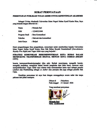 NIRMALA SARI, - (2026) STRATEGI KOMUNIKASI DISKOMINFOTIKSAN KOTA DUMAI DALAM MENDUKUNG TRANSFORMASI DIGITAL MENUJU KOTA CERDAS (SMART CITY). Skripsi thesis, Universitas Islam Negeri Sultan Syarif Kasim Riau.