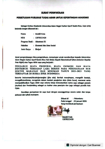 MEIDIL FIOLA, - (2026) PENGARUH BIAYA PRODUKSI, BIAYA PROMOSI, DAN BIAYA DISTRIBUSI TERHADAP LABA BERSIH PADA PERUSAHAAN MANUFAKTUR SUB SEKTOR MAKANAN DAN MINUMAN TAHUN 2021-2023 YANG TERDAFTAR DI BURSA EFEK INDONESIA. Skripsi thesis, UNIVERSITAS ISLAM NEGERI SULTAN SYARIF KASIM RIAU.