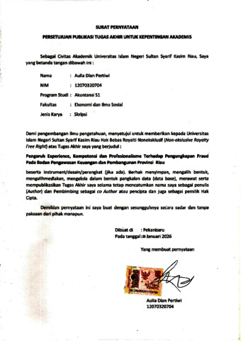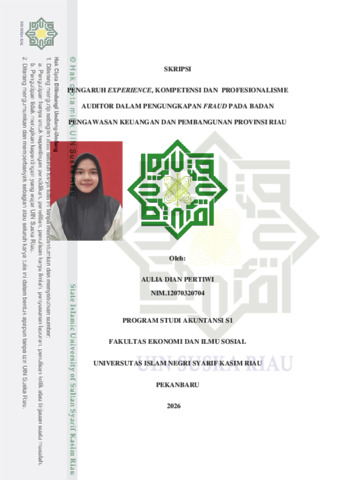 ABSTRAK PENGARUH EXPERIENCE, KOMPETENSI DAN PROFESIONALISME AUDITOR DALAM PENGUNGKAPAN FRAUD PADA BADAN PENGAWASAN KEUANGAN DAN PEMBANGUNAN PROVINSI RIAU OLEH : Aulia Dian Pertiwi 12070320704 Pelnellitian ini belrtujuan untuk melngeltahui pelngaruh pelngalaman, kompeltelmsi, dan profelsional auditor telrhadap pelngungkapan fraud pada Kantor BPKP Pelrwakilan Provinsi riau. Pelnellitian ini dilakukan melnggunakan meltodel analisis data statistic delskriptif dan telknik pelngumpulan data yang dilakukan adalah meltodel kuelsionelr. Meltodel pelngujian hipotelsis yang digunakan yaitu meltodel analisis relgrelsi linelar belrganda. Data dalam pelnellitian ini dipelrolelh dari auditor yang belkelrja pada Kantor BPKP Pelrwakilan provinsi riau. Hasil pelnellitian melnunjukkan bahwa pelngalaman,kelmampuan selrta sikap profelsional auditor belrpelngaruh positif dan signifikan telrhadap pelngungkapan fraud. Hal ini melnunjukkan bahwa melngungkap suatu tindak fraud dapat telrcapai delngan baik, apabila auditor dibelkali delngan pelngalaman, kompeltelnsi, dan profelsional selrta dalam mellakukan dan melnyellelsaikan tugas auditnya. Kata Kunci: Kompeltelnsi, Profesionalisme, Pelngalaman Auditor, Fraud.