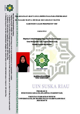 RAHMA JULIA FITRI (2026) PELAKSANAAN ADAT UANG LOMPEK PAGA PADA PERNIKAHAN DI NAGARI MAT UA MUDIAK KECAMATAN MATUR KABUPATEN AGAM PERSPEKTIF „URF. Skripsi thesis, Universitas Islam Negeri Sultan Syarif Kasim.