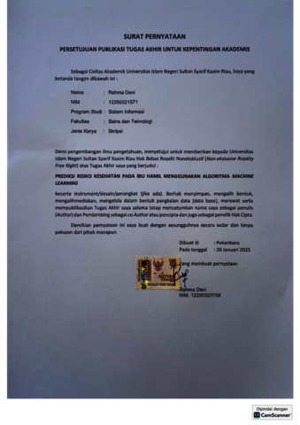 RAHMA DEVI, - (2026) PREDIKSI RISIKO KESEHATAN PADA IBU HAMIL MENGGUNAKAN ALGORITMA MACHINE LEARNING. Skripsi thesis, UNIVERSITAS ISLAM NEGERI SULTAN SYARIF KASIM RIAU.