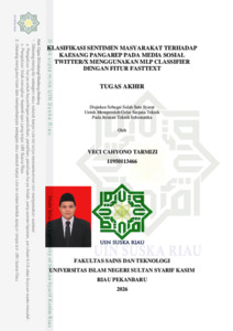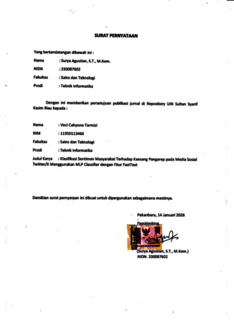 Veci Cahyono Tarmizi, - (2026) KLASIFIKASI SENTIMEN MASYARAKAT TERHADAP KAESANG PANGAREP PADA MEDIA SOSIAL TWITTER/X MENGGUNAKAN MLP CLASSIFIER DENGAN FITUR FASTTEXT. TIN: Terapan Informatika Nusantara, 6 (7). pp. 1105-1114. ISSN ISSN 2722-7987 (Media Online)