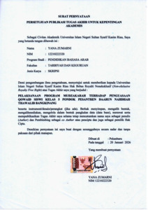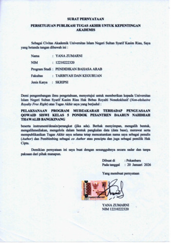 YANA ZUMARNI (2026) PELAKSANAAN PROGRAM MUDZAKARAH TERHADAP PENGUASAAN QOWAID SISWI KELAS 5 PONDOK PESANTREN DAARUN NAHDHAH THAWALIB BANGKINANG. Skripsi thesis, UNIVERSITAS ISLAM NEGERI SULTAN SYARIF KASIM RIAU.