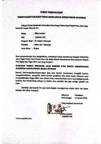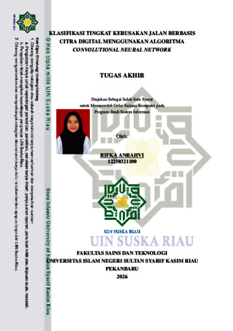 RIFKA ANRAHVI, - (2026) KLASIFIKASI TINGKAT KERUSAKAN JALAN BERBASIS CITRA DIGITAL MENGGUNAKAN ALGORITMA CONVOLUTIONAL NEURAL NETWORK. Skripsi thesis, UNIVERSITAS ISLAM NEGERI SULTAN SYARIF KASIM RIAU.
